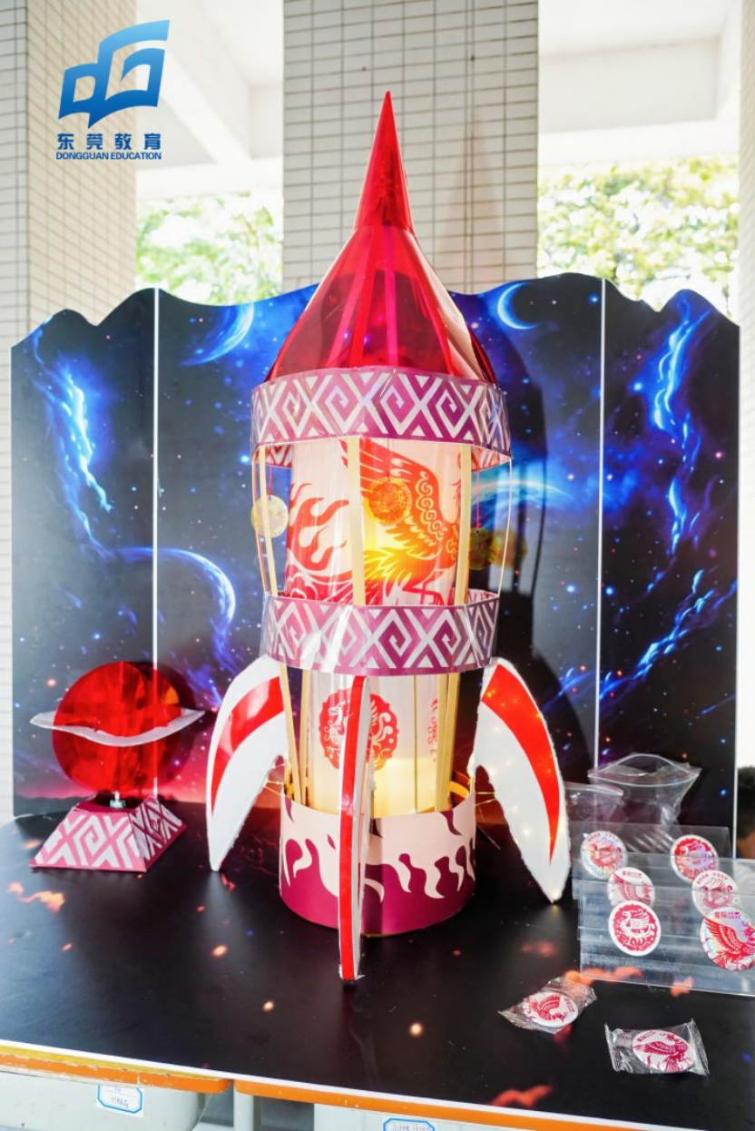 致敬中国航空,活动现场东莞中学初中部叶雨嘉和何泓雨带来火箭造型“走马灯”。叶雨嘉介绍说,作品在保留了灯彩制作工艺的基础上,用马达电机改造了传统走马灯,外观装点朱雀和回纹饰彰显中国元素,“作品希望将中国文化传承与现代科技创新的主题相结合,设计制作过程大约耗时两三个月。”